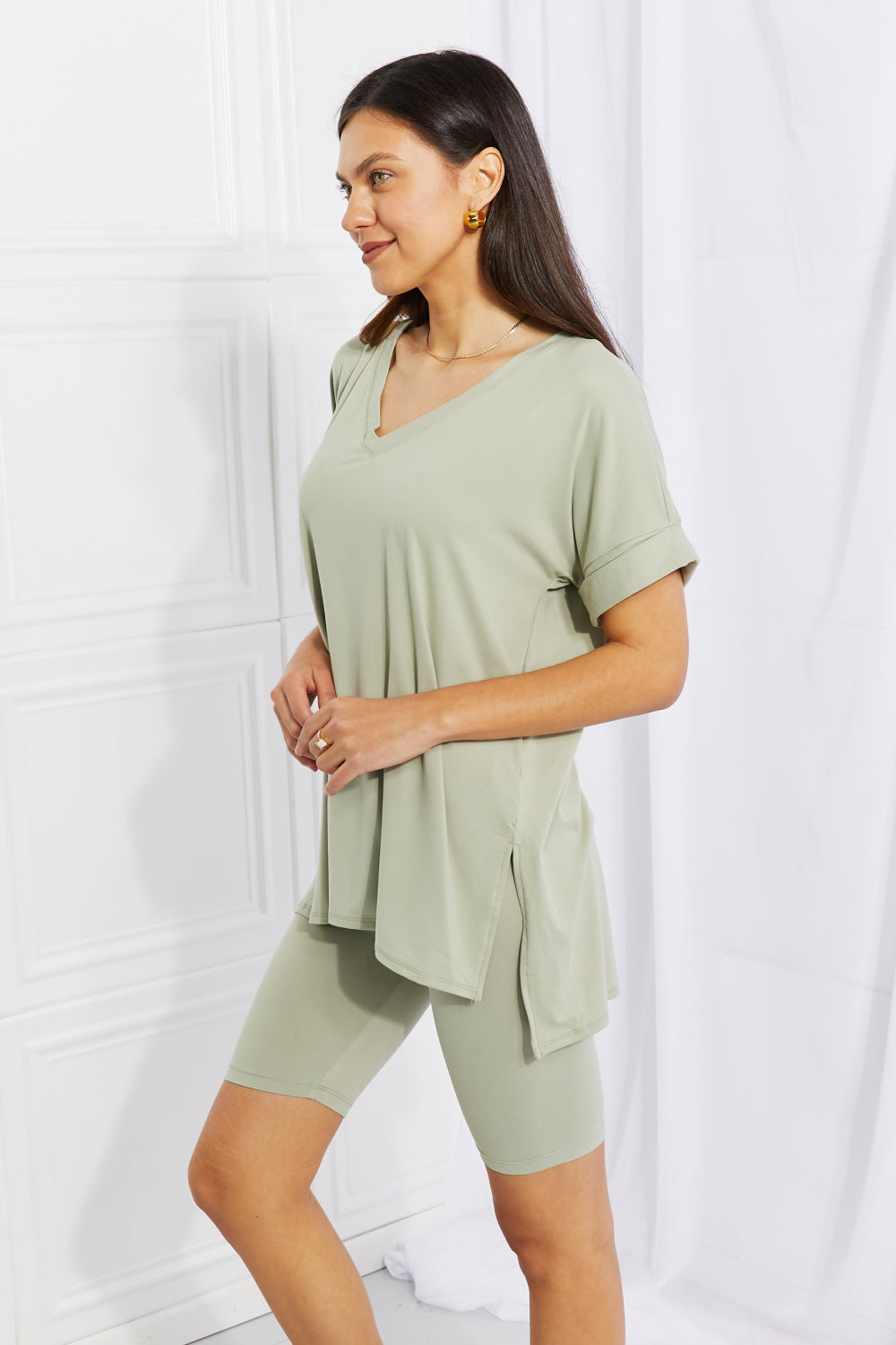 Quiet moments may be few and far between but comfort doesn't have to be! Your skin will love this set, which comes with a brushed DTY microfiber top and biker shorts. The high-low hem top allows for an easy front tuck to emphasize your waist, and the high rise biker shorts were made for comfort. Mix and match or wear together.